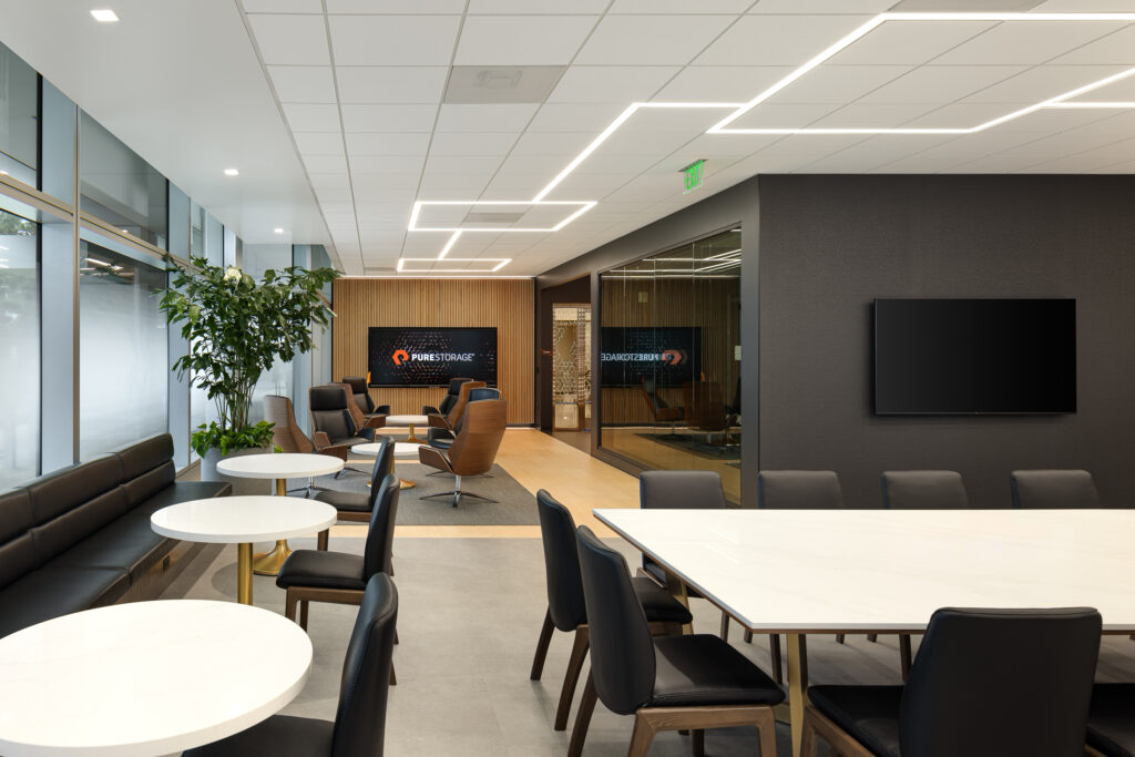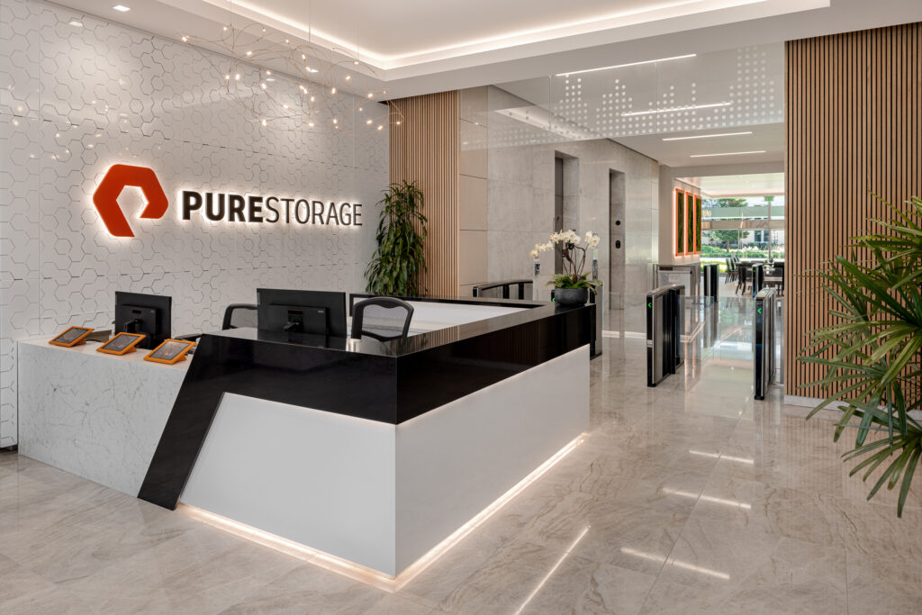 The Pure Storage project was one of my longest and most rewarding commercial assignments, spanning more than 18 months on site. The renovation unfolded in two phases, transforming several floors in one building before moving to the next. The result was a beautifully designed interior featuring original artwork on each floor, a cohesive visual identity, and an elevated workplace experience throughout the entire campus.